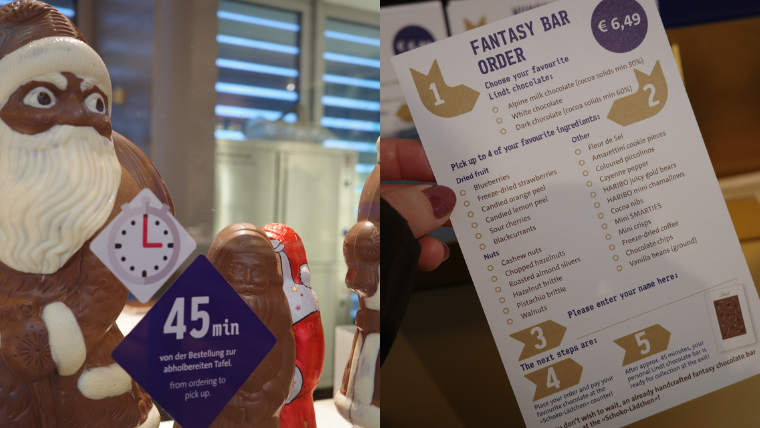 工場エリアの最後には、自分で味や具材(ナッツなど)をチョイスして、オリジナルのフレーバーチョコを作ってくれる場所もありました。その時の状況にもよるかもしれませんが、この日は45分待ちでした。