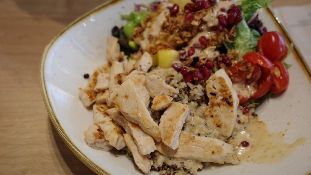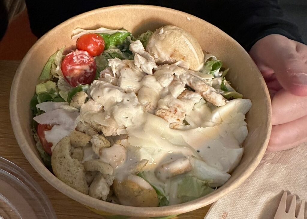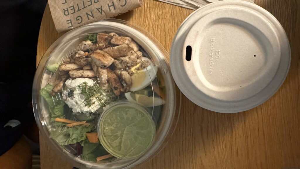 サラダとサラダラップをイートインでいただきました。チキンとお豆が入ったサラダだったので結構お腹にたまりました。朝だったからか人も少な目でゆっくりと食べれて良かったです。