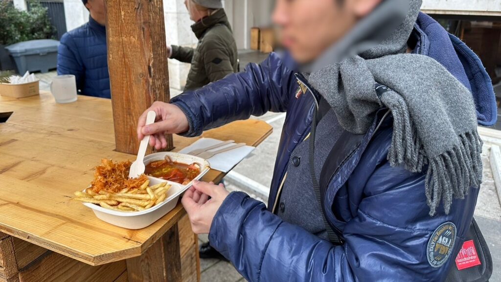 写真の右側がカリーブルストです。カリーブルストもおいしかったですが、左上のザワークラフトも美味しかった!見た目の量よりもお腹にたまるので、2人でシェアするのがおすすめです。