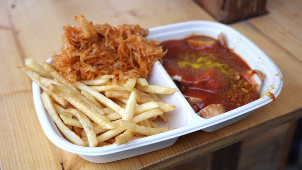 カリーブルストとは、ドイツのソウルフードで、ソーセージにカレー風味のトマトケチャップソースをかけてカレー粉をトッピングした料理です。
